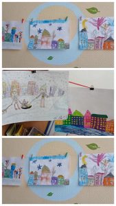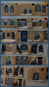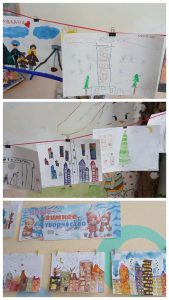 На рисунках можно увидеть заснеженные улицы, украшенные гирляндами, и занесенные снегом дома…Дети рисовали снежные горки, на которых катаются их сверстники, ледяные скульптуры и парки отдыха, покрытые снежным одеялом)