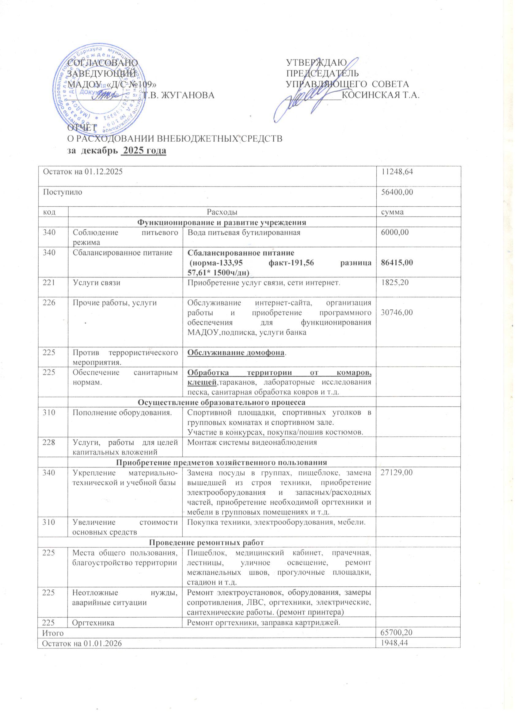 Отчёт о расходовании внебюджетных средств за декабрь 2025 год