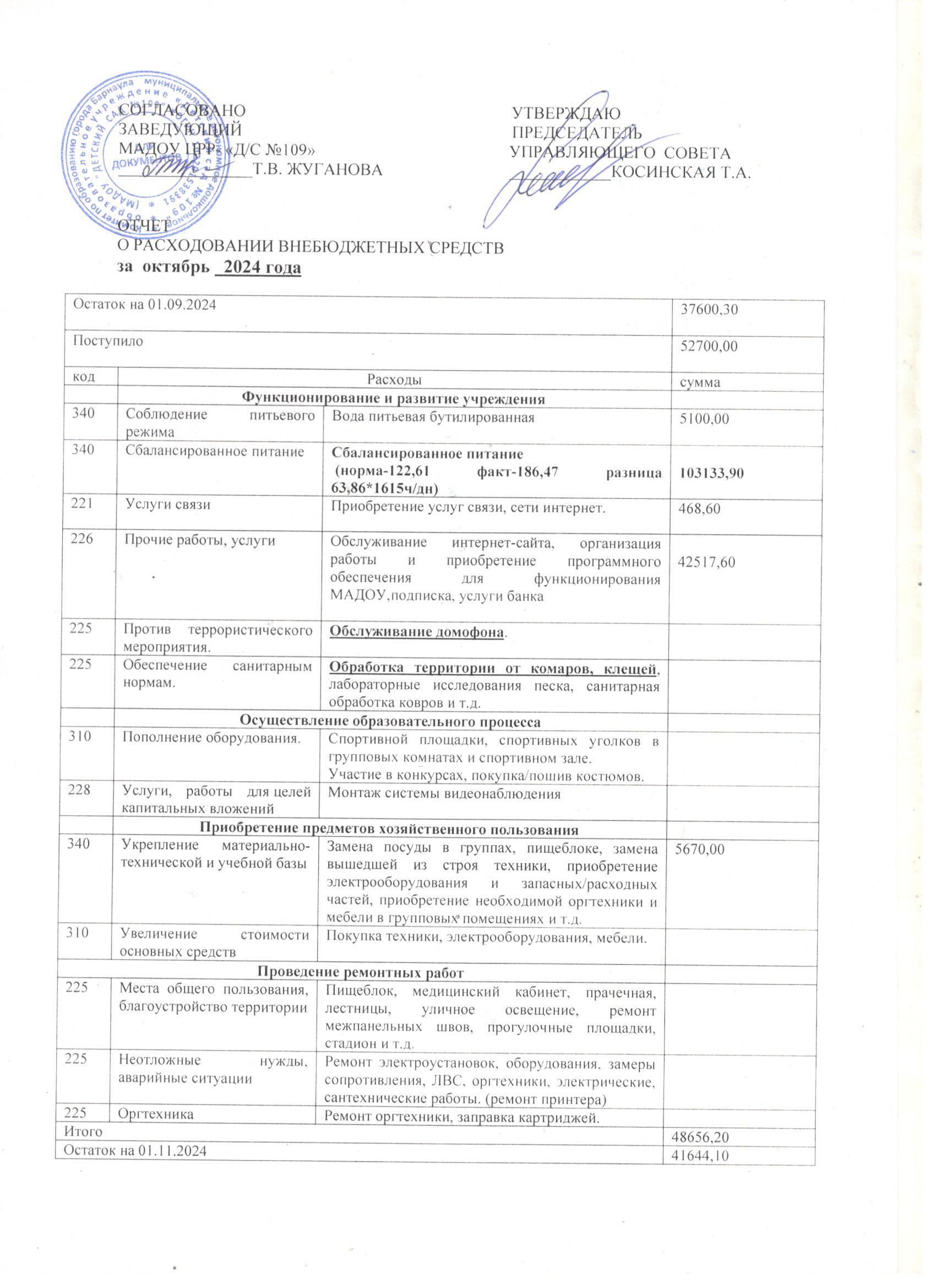 Отчёт о расходовании внебюджетных средств за октябрь 2024 год