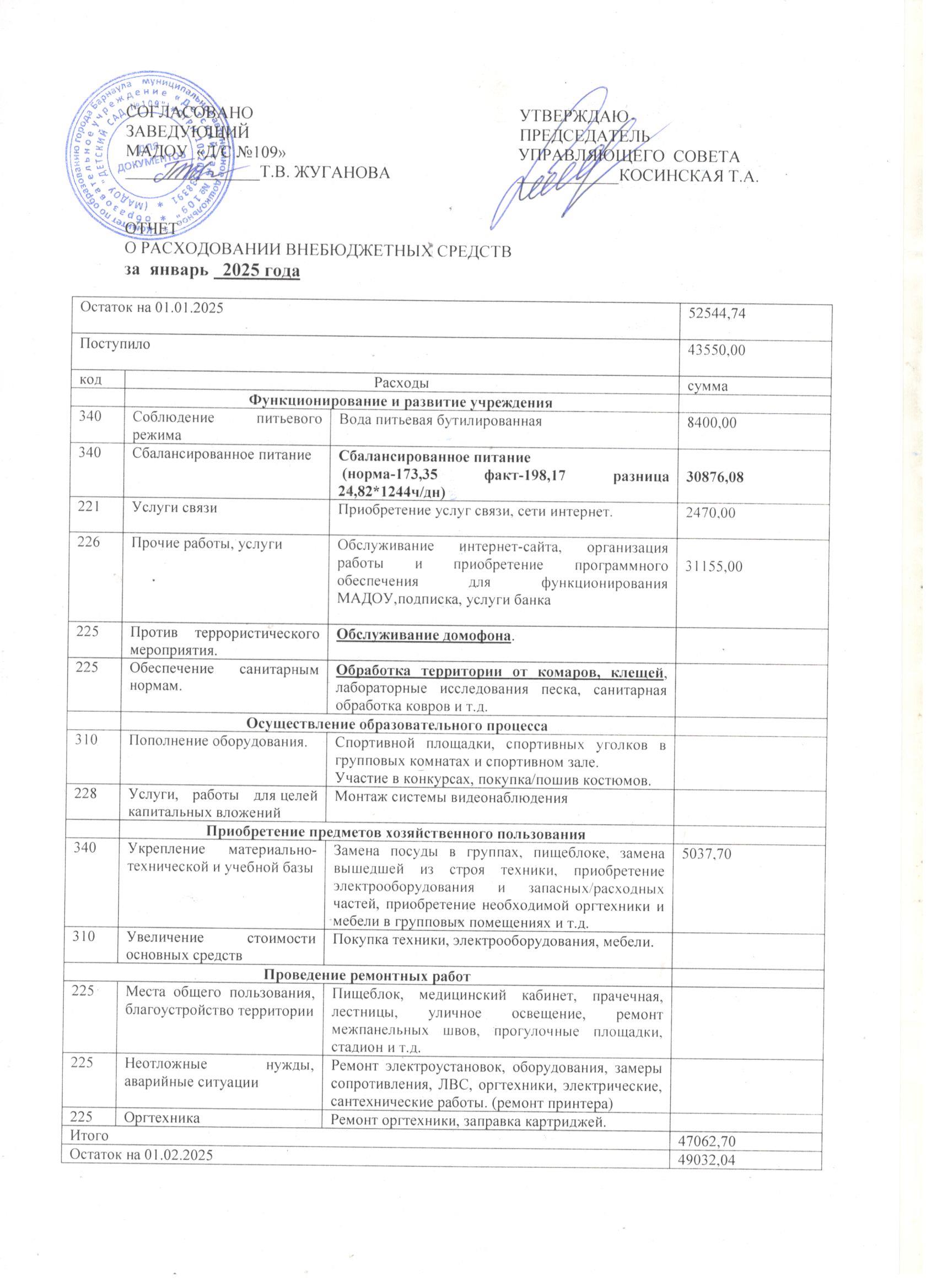 Отчёт о расходовании внебюджетных средств за январь 2025 год